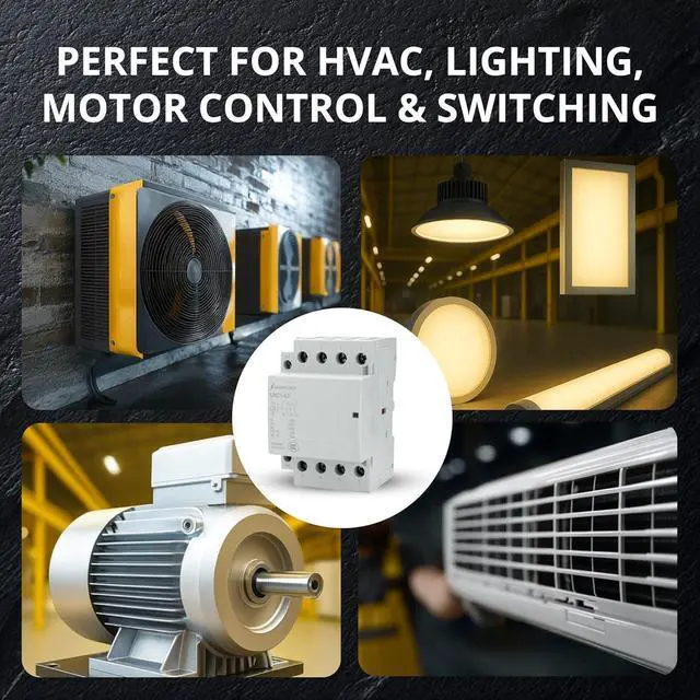 HVAC Parts Applications Suitable for lighting, motor, or switching tasks. AC-1 for resistance furnaces, incandescent lamps, or electric heaters; and AC-3 for air conditioners, compressors, or fans. Perfect for HVAC contactor and air conditioner contactor applications. Features an energy-saving, silent, and no-humming coil. Ideal for use in HVAC, motor, heating, and refrigeration.