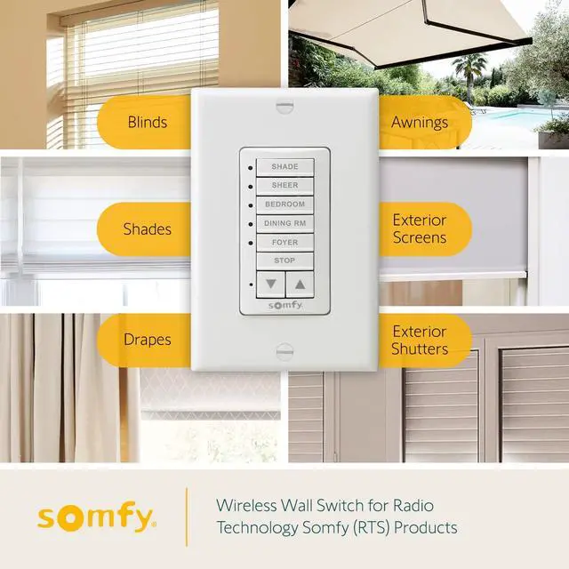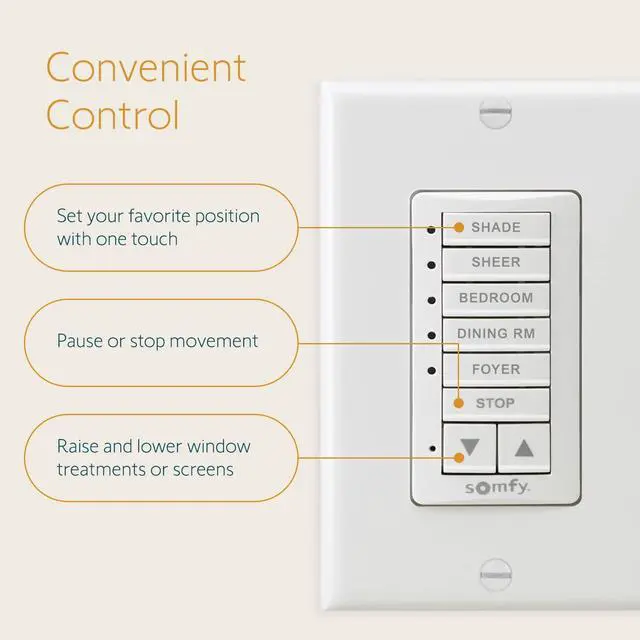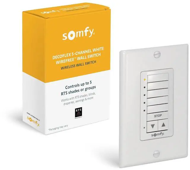 CONTROL 5 SHADES WITH DECOFLEX 5 - Tired of manually controlling each of your Somfy RTS devices? With one wall switch, you can effortlessly control up to 5 Somfy RTS devices or 5 groups of devices for maximum convenience!