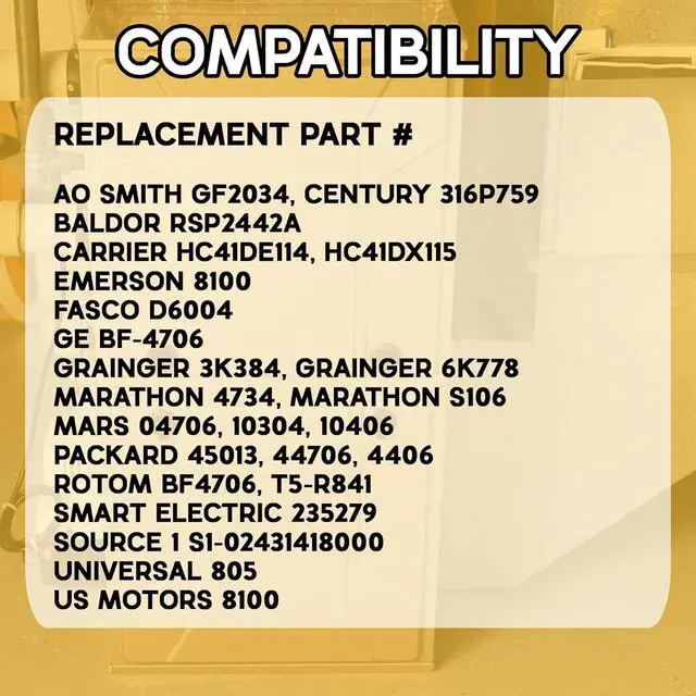 Versatile Compatibility: Compatible with multiple models including Packard 45013, Ao Smith 316P169, EMERSON 8100, GE BF4706, Universal 805, Baldor RSP2442, and Carrier HC41DE114