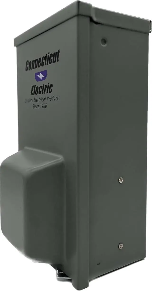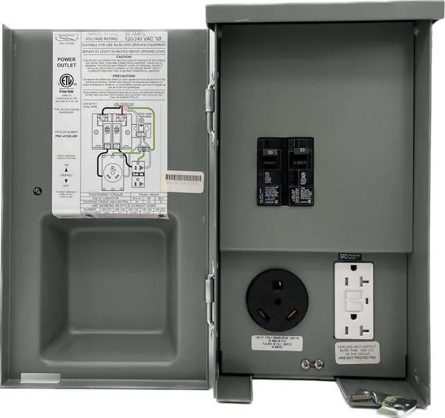 The CESMPSC41GRHR is a 30 Amp 120/240V power outlet with a 20 Amp one pole and a 30 Amp one pole circuit breaker designed by Connecticut Electric. It is ideal for the RVer who stores a motorhome, camper, travel trailer or pop-up trailer and wants electricity near by. Constructed from heavy-duty, powered-coated steel, this outdoor power outlet is rated as a NEMA 3R rainproof enclosure. Unique cover design allows cord to be used while door is closed. Power outlet comes factory wired and assembled. Hub provision is provided for use with Siemens HR style hubs. Lugs suitable for use with aluminum or copper wire. NEMA RECEP. TT-30R & 5-20R2 GFI