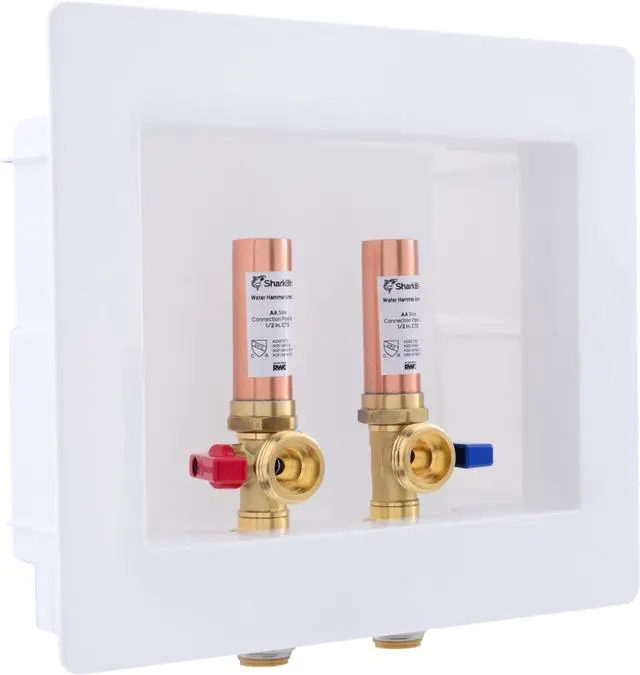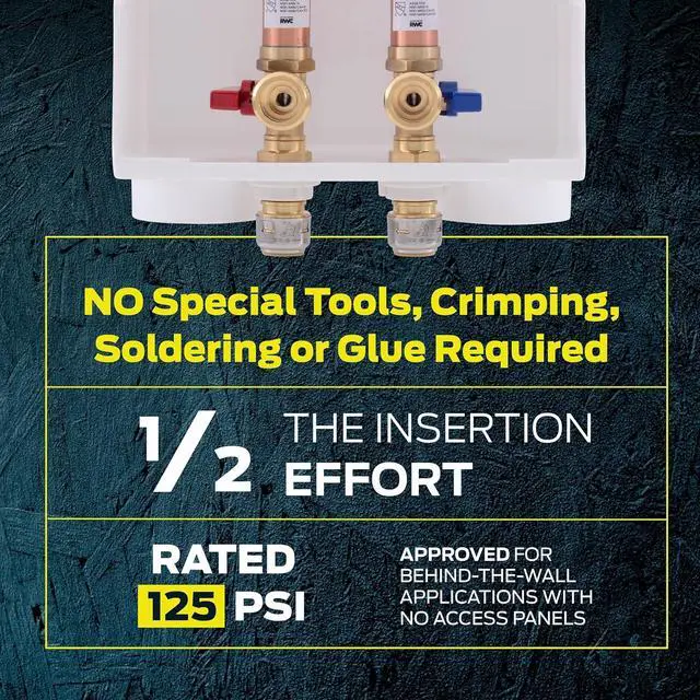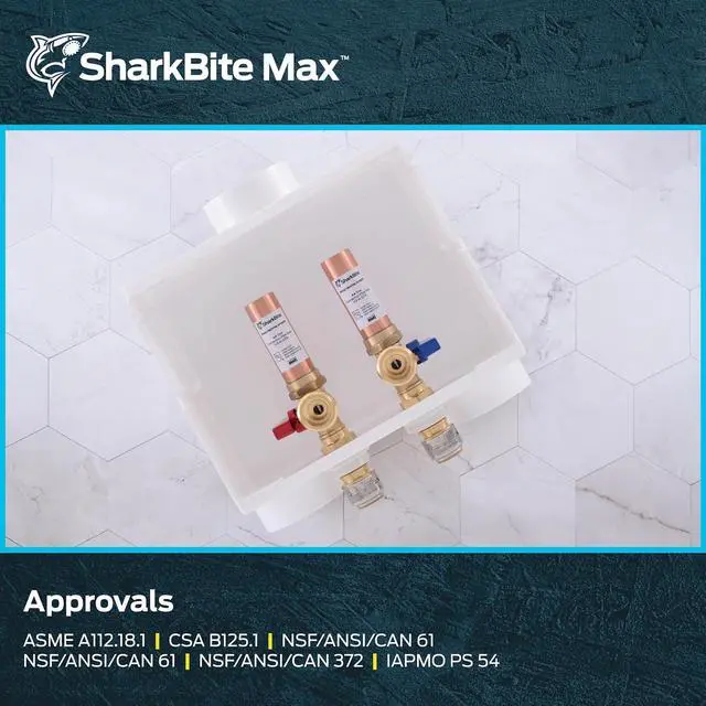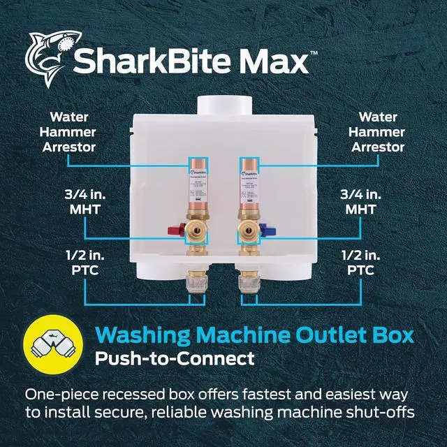 • EASY TO INSTALL: This washing machine outlet box is integrated with SharkBite push-to-connect ends to allow quick, easy installation of main water supply and shutoff for refrigerator icemaker and water dispenser. No need for soldering, glue, or any tools