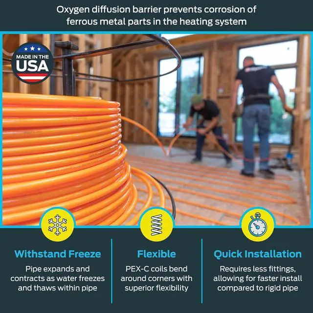 PEX TUBING: Flex pipe plumbing offers faster installation than rigid pipe and bends easily around corners; oxygen barrier layer limits oxygen permeation to support ferrous component longevity