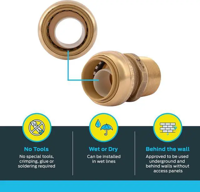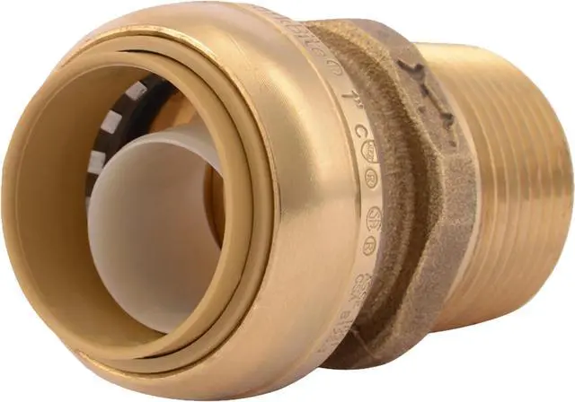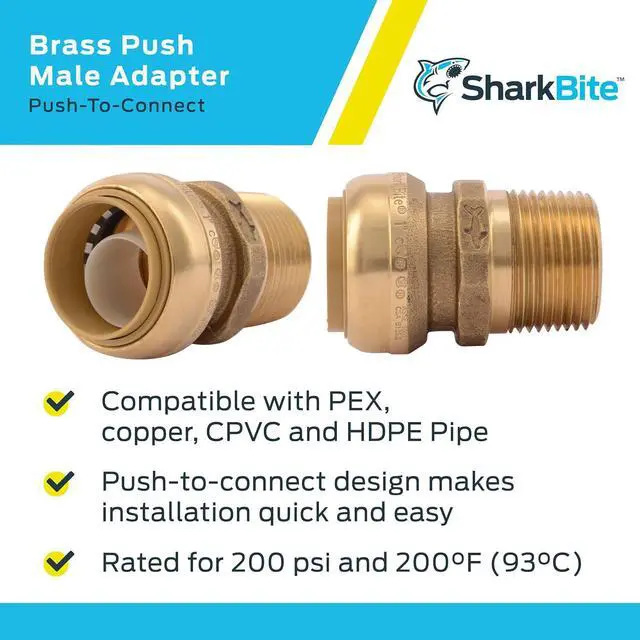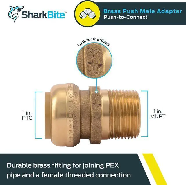 1 inch x 1 inch male iron pipe, lead free, straight connector, Shark Bite push fit fittings for use with copper tubing cts, cpvc & PEX with integral tube liner included, constructed of ds brass, certified to 200 psi & 200 degrees Fahrenheit, design certified to asset 1061/Nsf61 standards, meets upc, ipc & cupc requirements, fitting are listed with iapmo & are certified for use on potable & hydronic water distribution, certified for underground applications & as a manufactured joint without the need for access panels, lead free Compliant to federal law 111-380, bagged.