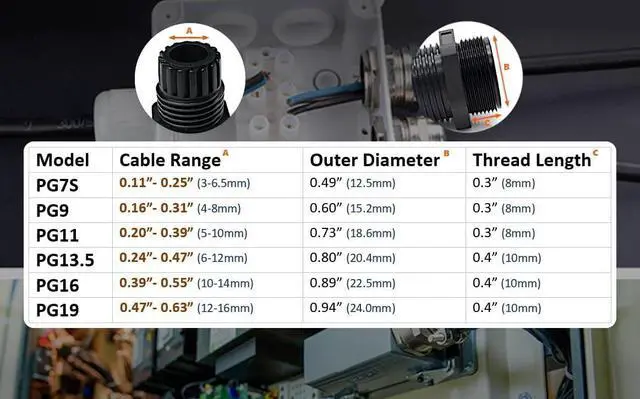 EASY INSTALLATION Simply pass your cable through the gland and tighten the cap. Fits wire diameters 0.11" to 0.63" (3 - 16mm)