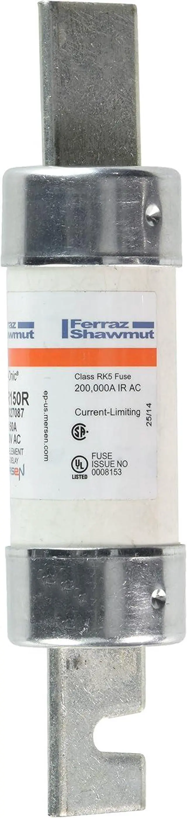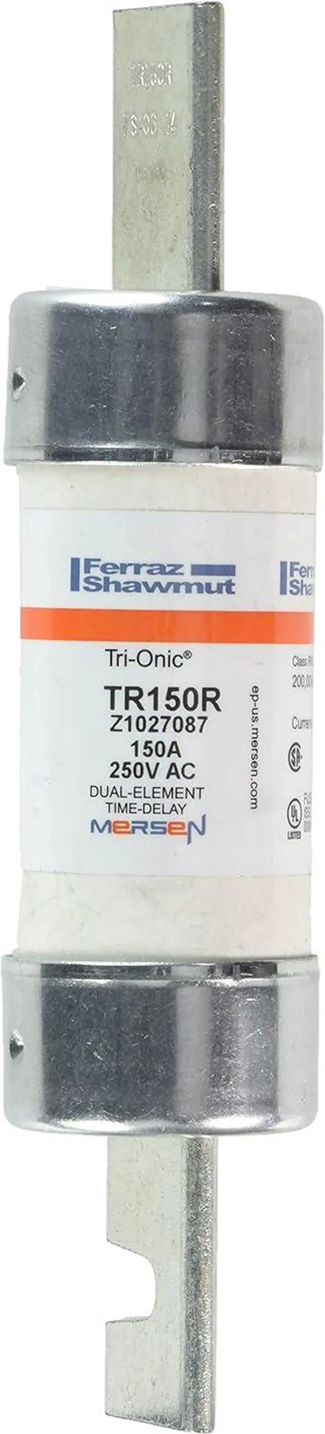 Mersen Tri-Onic time-delay/class RK5 fuse. Industry's most popular fuse for motor circuit protection with advanced material technology added to the existing product, the Tri-Onic TR current-limiting time-delay fuses are engineered for overcurrent protection of motors and transformers, service entrance equipment, feeder and branch circuits. Tri- Onic fuse proven time-delay characteristic safely handles harmless starting currents and inrush currents associated with today's motors and transformers. Features: metal embossed date and catalog number for traceability and lasting identification, Fiberglass body provides dimensional stability in harsh industrial settings, high-grade silica filler ensures fast arc quenching and high current limitation. Applications: motor circuits, mains, feeders, branch circuits, transformers, service entrance equipment, general-purpose equipment. Approvals: UL listed to standard 248-12 file E2137. CSA certified to standard C22.2 no. 248.12. 250VAC/250VDC voltage rating. 200kA AC/20kA DC interrupt rating. 150 ampere current rating. Measures 1-9/16-inches diameter by 7-1/8-inches length.