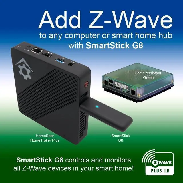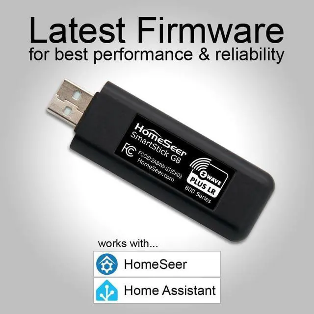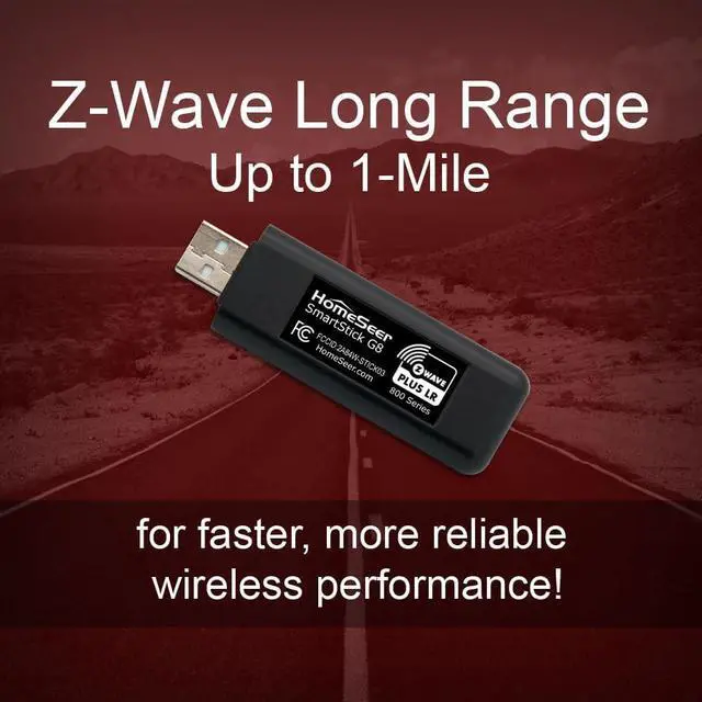 800 SERIES Z-WAVE LONG RANGE (LR): SmartStick G8 LR wireless range of up to 1.5 miles with LR compatible software and hubs. Z-Wave JS UI v9.10.0 (or later), used by HomeSeer (with Z-Wave Plus plugin) and Home Assistant, supports this feature. Note: End devices must also support Z-Wave LR and must be added to your system as LR devices.