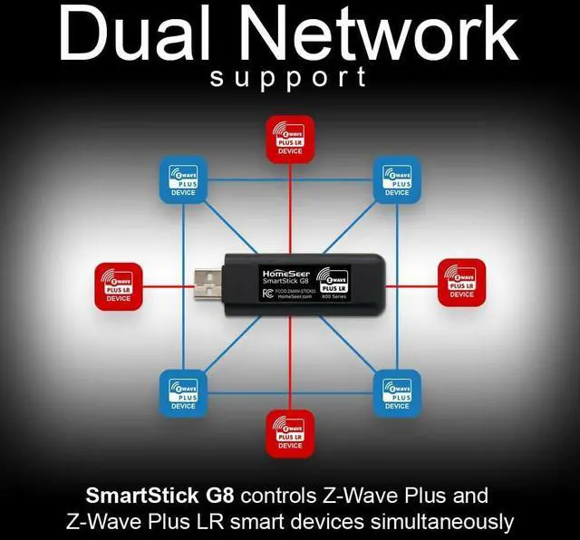 DUAL NETWORK SUPPORT: SmartStick G8 is designed to manage a standard mesh network (for non LR devices) and a long range network (for LR devices) simultaneously. Install standard Z-Wave devices within your home and LR devices outside your home and manage them all for Z-Wave LR compatible software and hubs (like HomeSeer and Home Assistant).