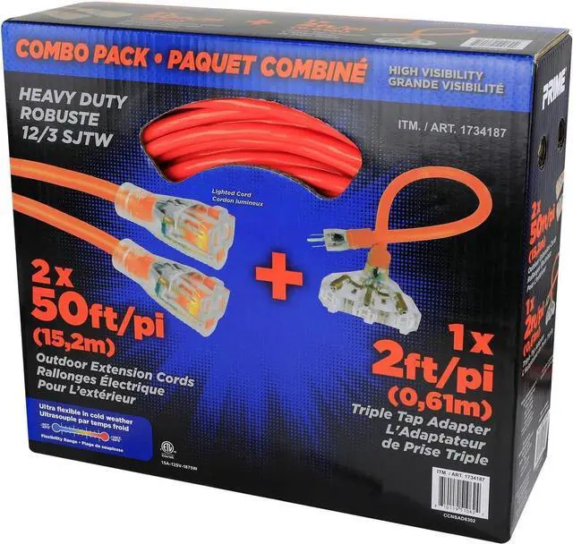 Combo pack includes two 50 feet (15.2m) length cords and one 2 foot triple head adapter cord.