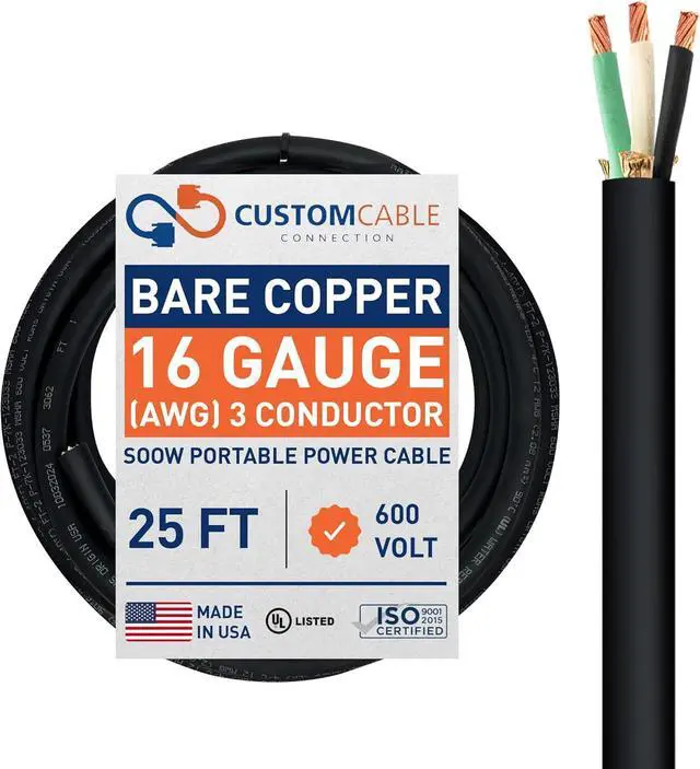 FULLY ANNEALED STRANDED BARE COPPER: 16 AWG fully annealed stranded bare copper conductors per ASTM B-174. Insulated conductors (black, green, white) are cabled with fillers as necessary to make round, a separator is applied over the assembly. Insulation Thickness 0.76 mm / 0.030 inches. Outside Cable Diameter 0.390 inches. The overall jacket of this cable is a black, oil-resistant thermoset compound per UL 62