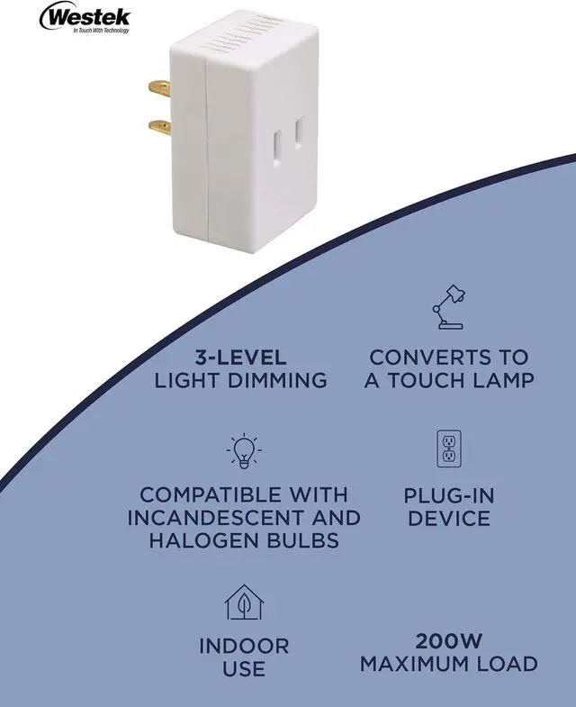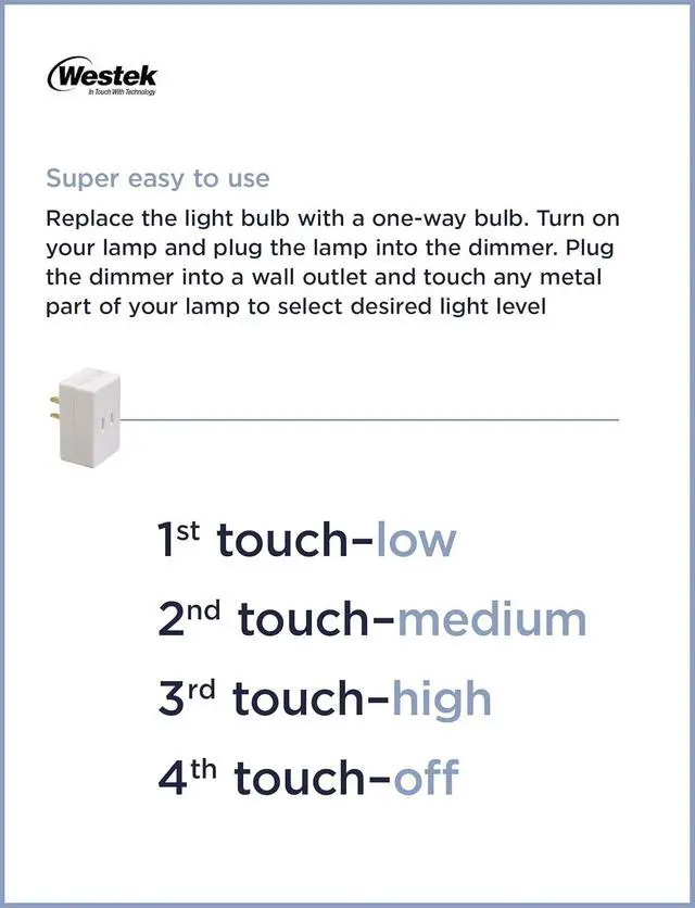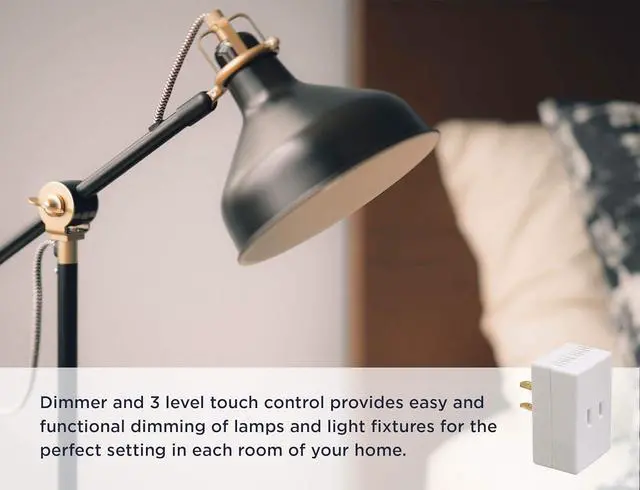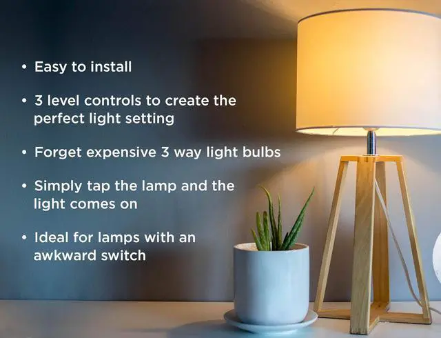 Converts any lamp with metal to a touch dimmer by simply plugging into a standard outlet