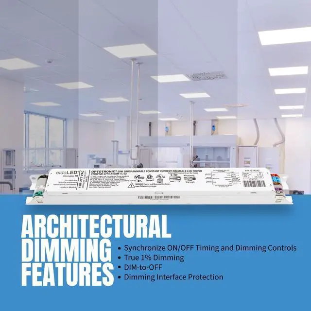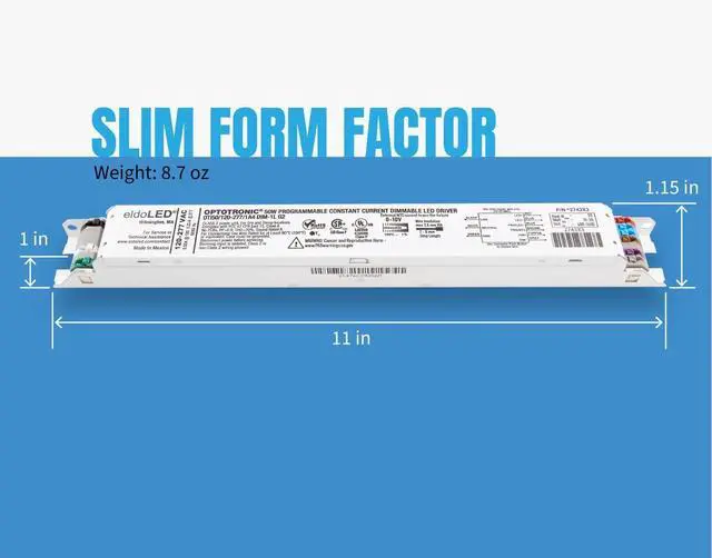 OPTOTRONIC Linear Programmable LED Driver Constant Current, 0-10V Dimmable LED Driver Input Voltage: 120-277VAC 50/60 Hz Pout: 50W, Vout: 10-55VDC, Iout: 400-1400mA UL Class 2 output for safe operation, Class P For Dry and Damp Locations