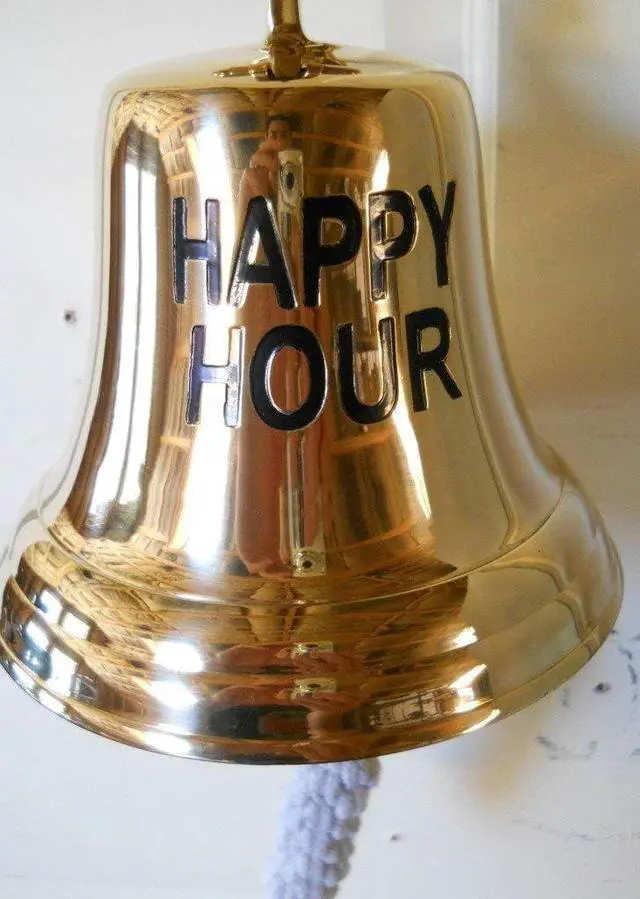 Measures 16"H x 7"W^Attractive bell in solid brass with "HAPPY HOUR" inscribed on front^Notify your patrons it's time to celebrate with your "Happy Hour" special^Brass mounting hardware included^We also sell a TIPS bell and a LAST CALL bell