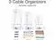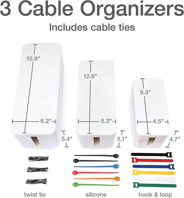 3 white cable management boxes with lids, 6 hook and loop ties (blue, red, green, yellow, black, white), 6 silicone ties (black, red, blue, green, orange), 3 black twist ties that can be cut to size