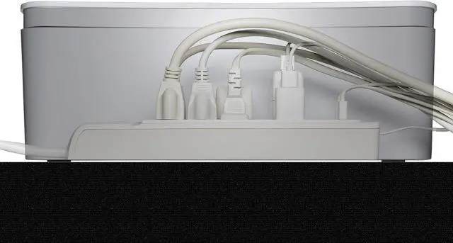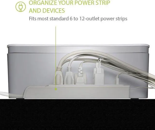 FRIENDLY REMINDER- In-Box Cable Box Organizer fits most standard 6-12 outlet power strip. Power strip and chargers are not included.