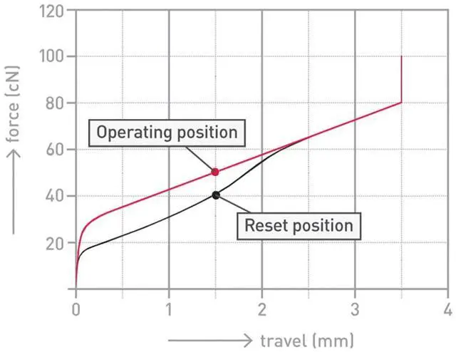 0.8 mm pre travel,2.8 mm total travel, 70,000,000 lifetime.