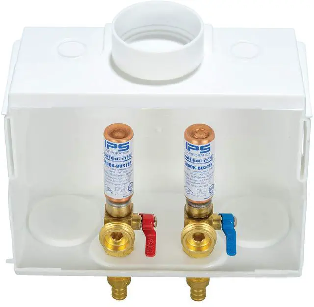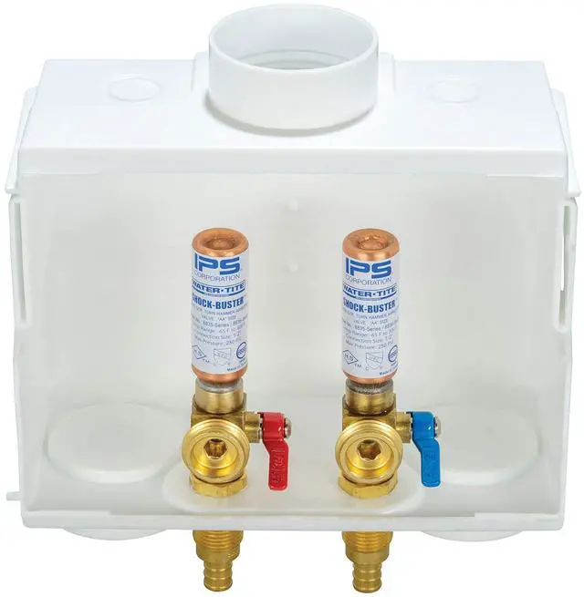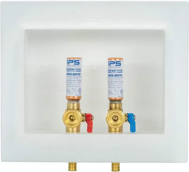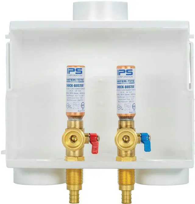 Water-Tite 85714 Du-All Dual Drain Washing Machine Outlet Box with Brass Quarter-Turn Hammer Arrester Valves Installed, 1/2" PEX Connection, White