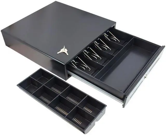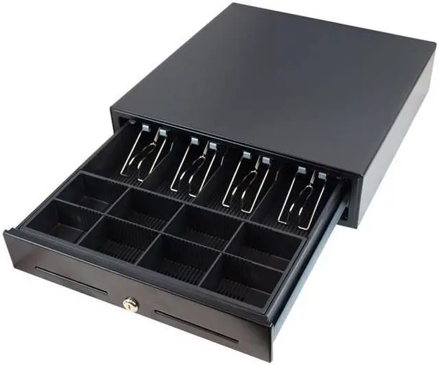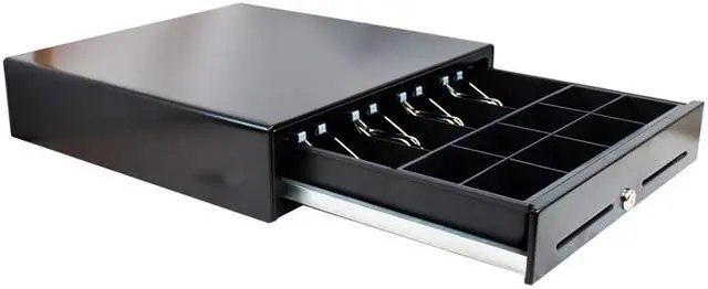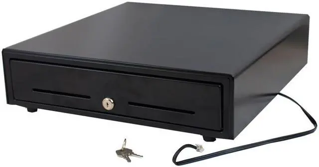 Our most popular model! The 16-inch cash drawer is perfect balance between durability and price. This model is perfect for any type of business and its sturdy all steel construction makes it durable but sleek and lightweight. The 16-inch cash drawer features an inside cash tray of 4-bill, 8-coin molded till, 3 position lock and a direct drive interface that is compatible with POS terminals.