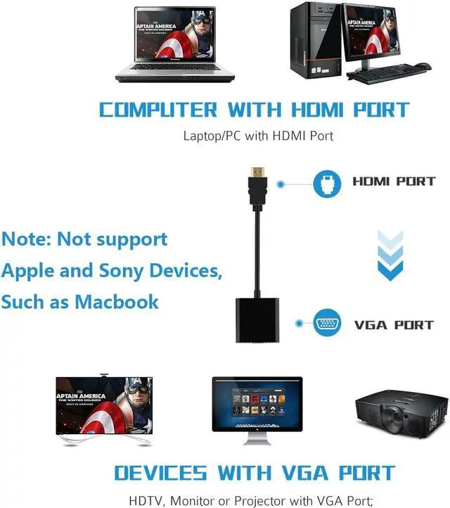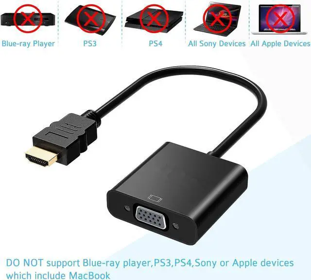 Play Please Note: 1. HDMI-VGA conversion does not work for copyright protected contents. 2. This adapter is not compatible with PS3/4, Xbox, or Blu-ray player 3. This is not a bi-directional adapter. It only transfers signal from HDMI to VGA.