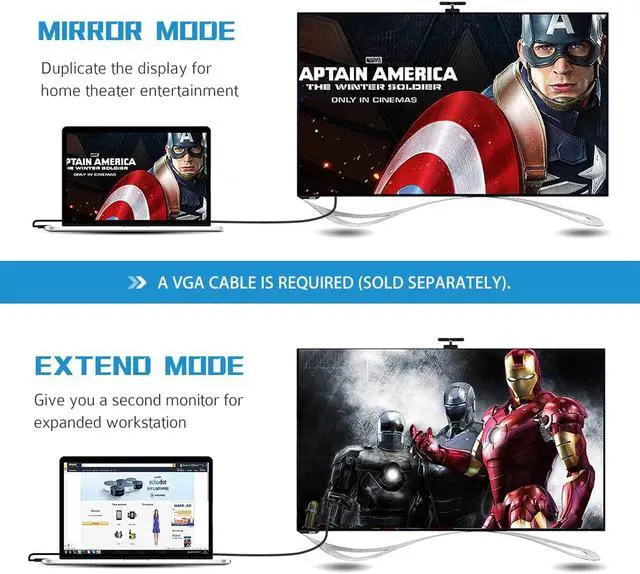 Male Output: VGA Female; A VGA cable (sold separately) is required