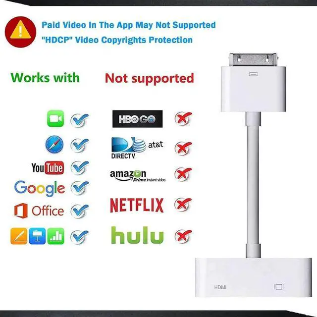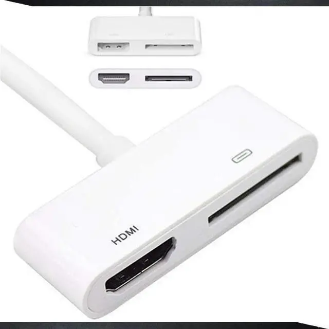 This 30-Pin AV HDMI adapter is a great accessory for your iPad, iPhone and iPod Touch. Put your slides, movies, photos, and everything else that fills your iPad 2 screen on an even bigger screen - your HDTV. This 30-Pin AV adapter mirrors exactly what you see on iPad 2 so that everyone in the room can enjoy it on your widescreen TV, video projection screen, or other HDMI-compatible display. Feature - Plug And Play. - No external power supply required. - Watch movies, videos (DIY, YouTube on web page only), MTV, Podcast, slideshows and photos on your HDTV via iPad/iPhone/iPod Touch. - Video out supports up to 1080p for iPad 2 and iPhone 4S and up to 720p for iPad, iPhone 4 and iPod touch (4th generation). It can now using this adapter to share videos and slideshows on a big screen with your family and friends. - A second Female 30-pin connector built into the AV adapter lets you charge and synchronize your device while it's connected to your HDMI-compatible display. - Supports transmission of HD video and audio to HD TV or Projector. Supports HD video of 720p video format on iPad 1/ iPhone 4 4s , Full HD 1080P on ipad2 /3, the new iPad. Note: 1) For iPhone 4, this cable converter is only work with videos on the original app. Only iPhone movie players and iPhone applications that support video out will take advantage of the HDMI adapter. 2) SkyGo, Lovefilm and movies from iTunes does NOT support HDMI output. 3) Netflix currently is unavailable due to Copyright Restrictions. Compatible For: - iPad 2, iPad 3, iPhone 4S, 720p for iPad, iPhone 4 and iPod touch (4th generation) - Fully Support IOS 9.2 and above Package includes: 1 X 30-Pin to HDMI Cable Digital Adapter Charger