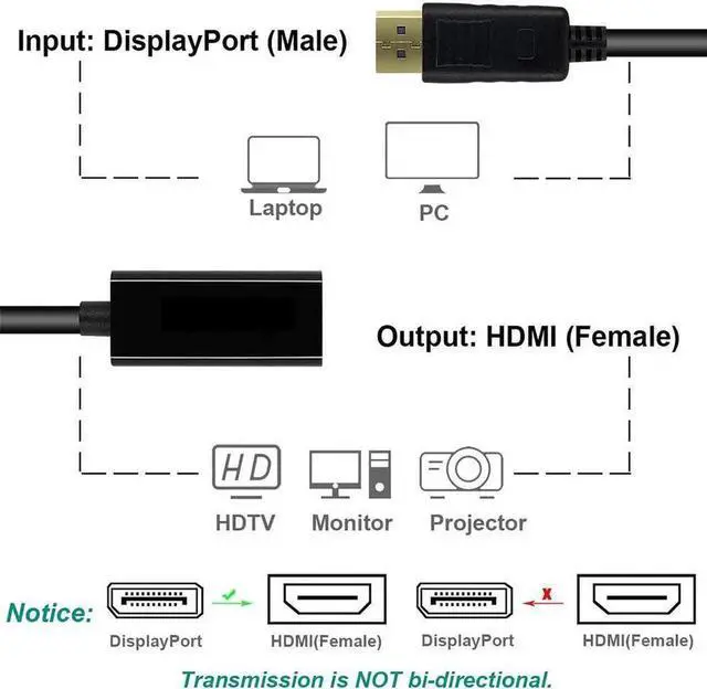 SUPERIOR STABILITY: Built-in advanced IC chip converts DisplayPort signal to HDMI signal; It is NOT a bi-directional converter and cannot transmit signals from HDMI to DisplayPort