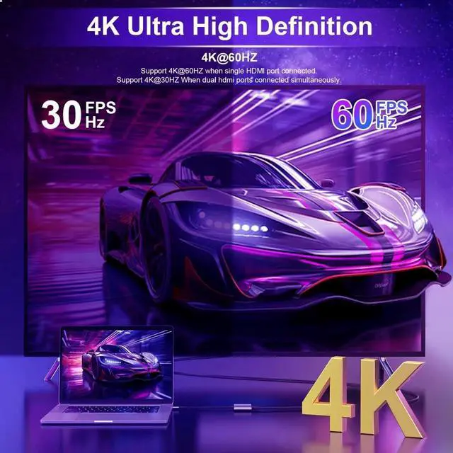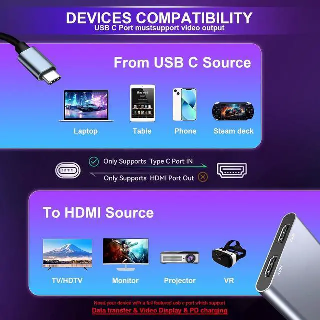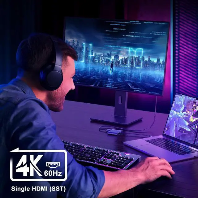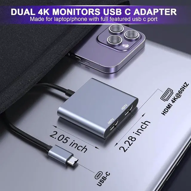 Type C to Dual HDMI HubThis USB C to Dual HDMI Adapter allows you to stream movies games from Macbook iPad pro or other USB C host device to a HD big screen for enjoy clearer and more stunning image. With 2 HDMI ports this Type C to hdmi adapter supports expand your workspace or media content on two screens simultaneously4K@60Hz UHDWhile single use one HDMI port resolution up to 4K@60Hz dual monitor with HDMI at 2x 4K@30Hz(3840x2160@30Hz). With this high-performance USB-C adapter it will achieve real-time transmission of high-definition images without delay very suitable for gaming enthusiasts professional draftsmen and video editors.