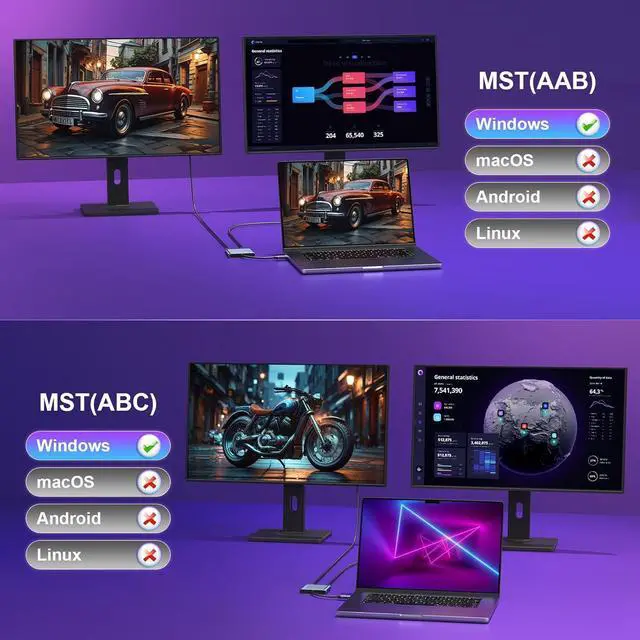(Note: NOT for all USB-C port laptop before you purchase please confirm your usb c laptop supports Thunderbolt 3/4 video output or DisplayPort Alt Mode)Mirror Mode & Extend ModeWindows supports Mirror Mode and Extend Mode; For Mac OS it ONLY Mirror Mode Can't extend two different Screen due to Mac OS limitation; Android only support Mirror Mode