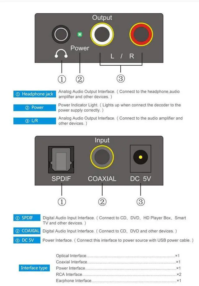 Converts DTS/AC3 source digital audio signal to 2.0 ch stereo audio output.
