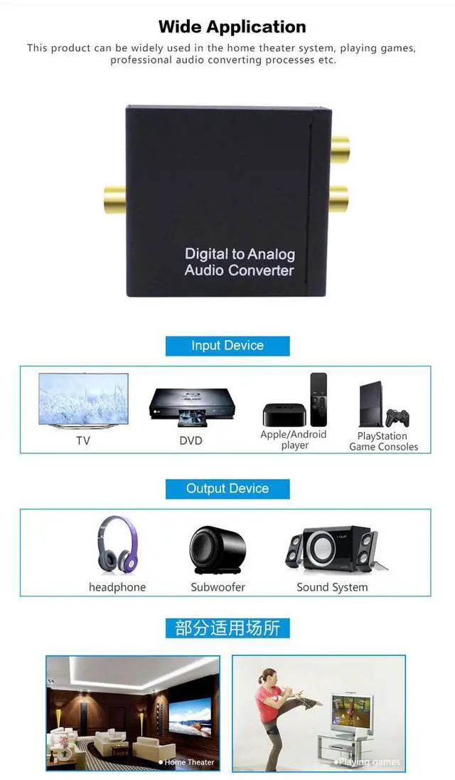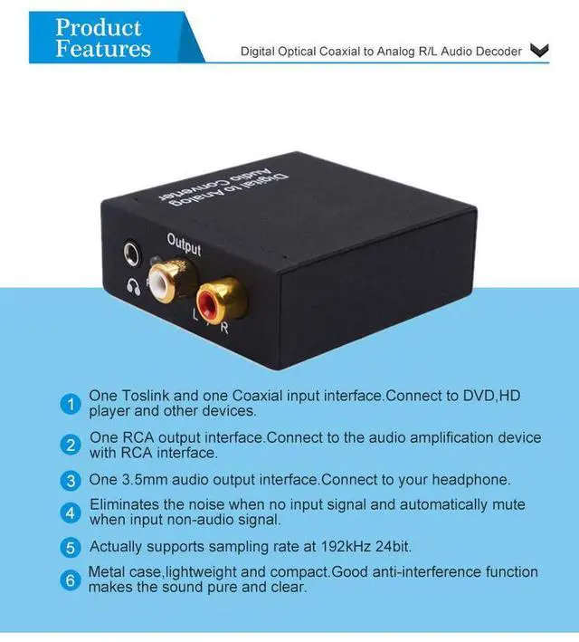 This Digital to Analog Audio Converter is designed for either home or professional audio switching. It converts Coaxial or Toslink digital audio signals to analog L/R audio.