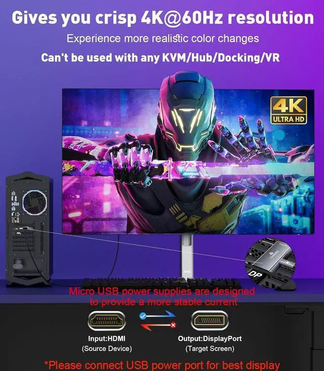 Play: Compared to traditional adapters this HDMI male to Display Port female adapter uses an advanced IC chip to convert HDMI signals to DP signals plug it into your HDMI-equipped device and then plug in the included Micro USB power cable to power the built-in chip for the best viewing experience.
