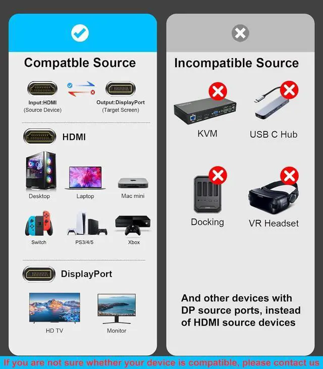 Note: It is not a bidirectional converter and can only transmit signals from HDMI male to DisplayPort female in one direction. 1440P@144Hz and HDR are not supported. If you are not sure please contact usWide