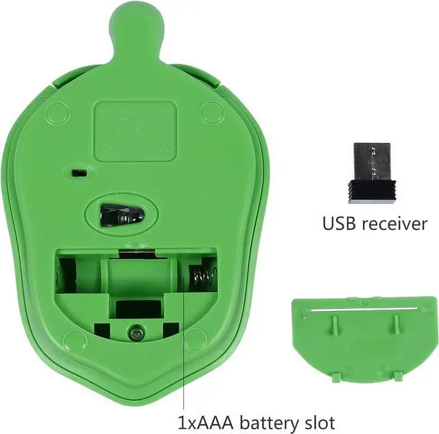 elec Space Kids Mouse for Laptop Small wireless mouse, which is a good choice for kids and small hands This green mouse is slightly smaller than a normal mouse, suitable for kids and small hands, give them a specially-made mouseHow to use 1. Remove the battery cover at the bottom to find the battery slot and USB receiver. The USB receiver is plugged near the battery slot. 2. Take out the USB receiver and plug it into the USB port on your PC. Put in one AAA battery (Not included). 3. Turn on the power switch. The optical sensor flashes a red light. 4. Installation will take a few seconds. Wait for a while and you can use the mouse. If it doesn't work, try using the mouse on another USB port or computer. You can also turn off the mouse switch, remove the USB receiver, and repeat steps 2-3 above.