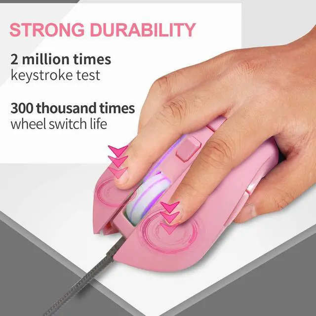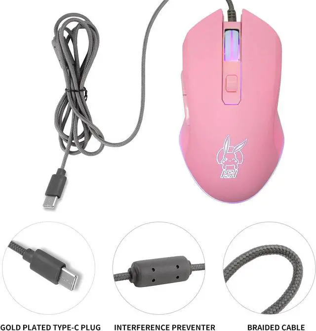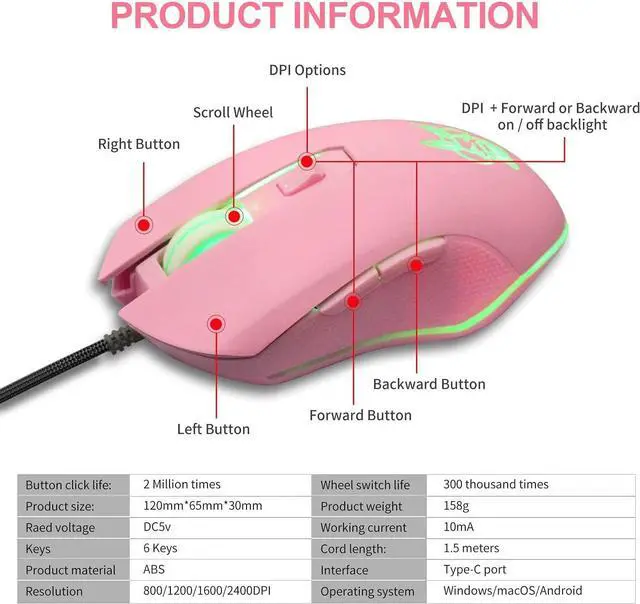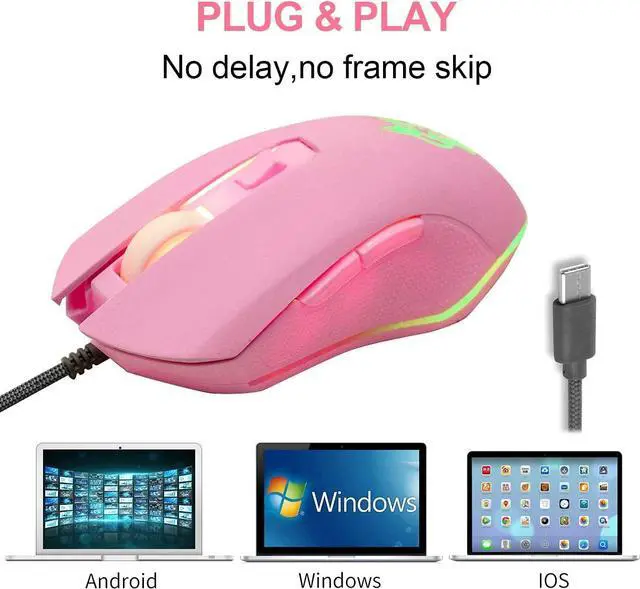 Cool RGB BacklightThe USB C mouse with 7 kinds of LED lights and unique side flow lighting effect to meet your different style of game needs unique rainbow RGB mice streamer effect. With multiple RGB lighting modes, you can choose the gaming mouse RGB lighting you want. ^^Wired Gaming Mousewired transmission brings stable signal, user could enjoy smooth gaming fighting. As a wired mouse, it is stable transmission performance and no delay operation. ^^Silent Buttons Silent left and right mouse buttons, Suitable for Office, Home, libraries, conference rooms, coffee shops and other occasions.