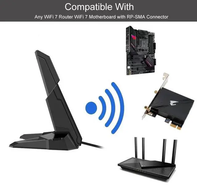 Elevate your WiFi experience with this high-performance Tri-Band 802.11BE WiFi 7 antenna designed for cutting-edge gaming and networking setups. This external antenna features the latest WiFi 7 technology, offering superior connectivity and bandwidth for demanding applications. The magnetic base provides stable, versatile mounting options while the RP-SMA connector ensures compatibility with ASUS ROG gaming motherboards and other compatible devices. Perfect for desktop computers and extendable routers, this antenna helps maximize your network's potential. The thoughtfully engineered design delivers enhanced signal reception and transmission across all three frequency bands. Whether you're gaming, streaming, or requiring reliable high-speed connectivity, this antenna serves as a powerful upgrade to your existing WiFi setup. Its sleek profile and practical mounting solution make it an ideal choice for both aesthetic and functional considerations in your gaming or workspace setup.