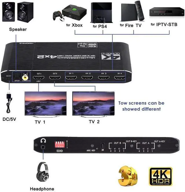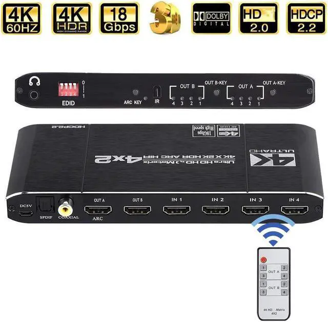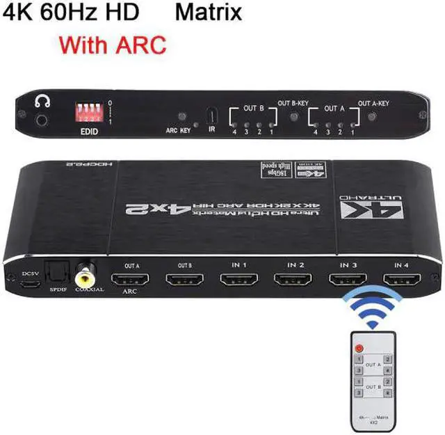 -compatible Matrix switch 4x2 with 16 EDID mode,2xSPDIF Audio and 2x3.5mm L/R Audio.(2) 4K 60Hz With ARC-compatible 2.0b and HDCP 2.2,4K@60Hz