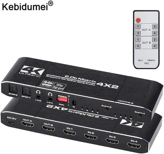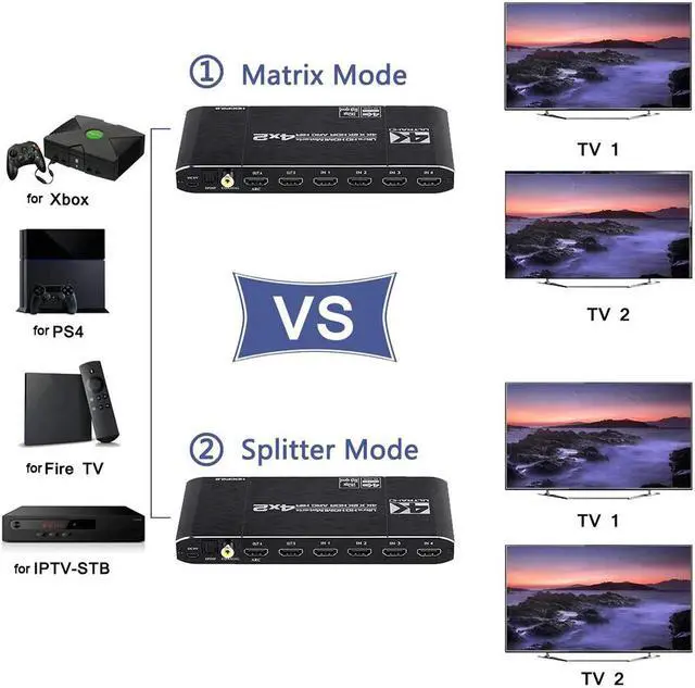 4x2 -compatible Matrix -Compatible Switch Splitter with SPDIF and L/R 3.5mm HDR -Compatible Switch 4x2 Support HDCP 2.2 ARC 3D 4K@60HzDescription:4x2 -compatible Matrix Switch is with 4 -compatible inputs and 2 -compatible outputs. It is a true matrix and can distribute any one of 4 sources to either of 2 displays, and can work as a splitter to show the same source on 2 displays simultaneously. It