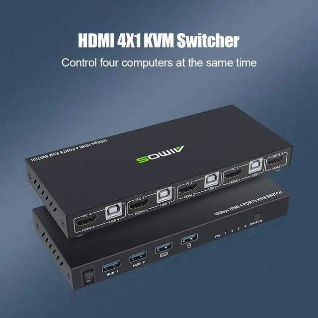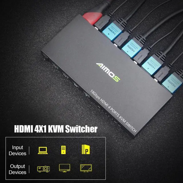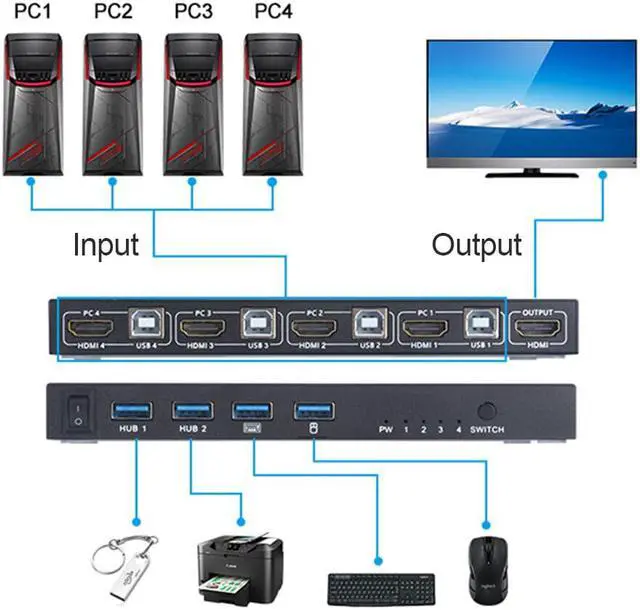 KVM Switch 4 Port 4K USB Switcher Splitter Box for Sharing Monitor Printer Keyboard Mouse Adaptive EDID/HDCP Decryption Plug and Paly