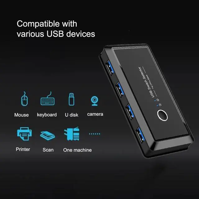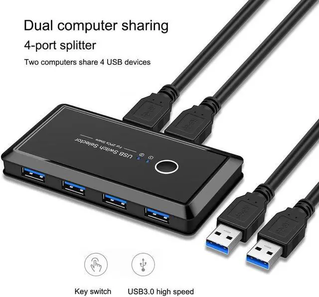 1. This 4-port USB shared switch allows a button to be exchanged between 2 computers, sharing 4 USB 3.0 peripherals without the need to constantly change cables or set up complex network sharing software.