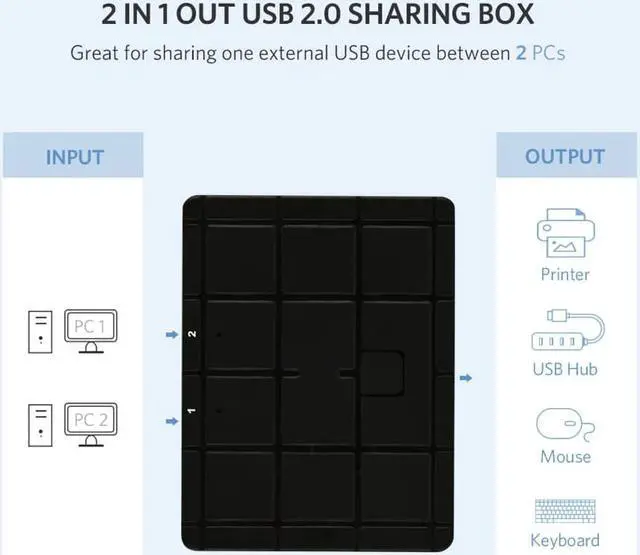 1. 2 in 1 out design: This practical KVM Switch box enables to control 2 PC hosts to a single monitor and share a mouse and keyboard set.