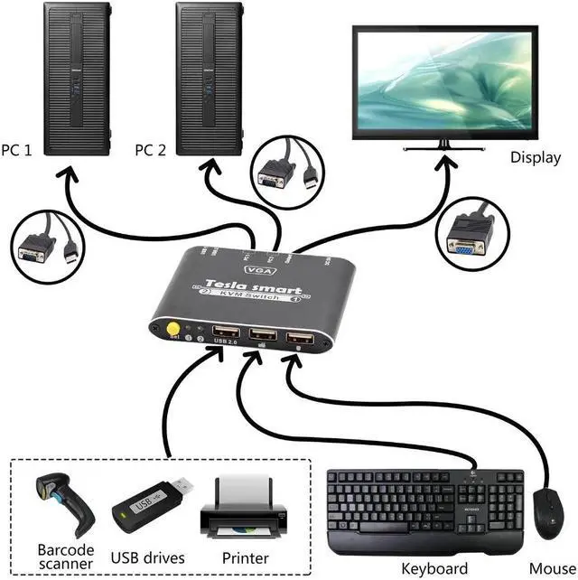 KVM Switch share a display with VGA connection, a USB keyboard and mouse, with 2 USB computers
