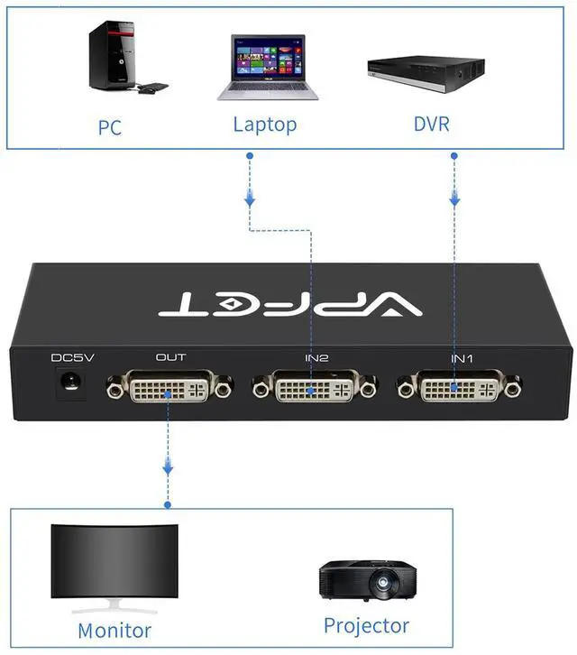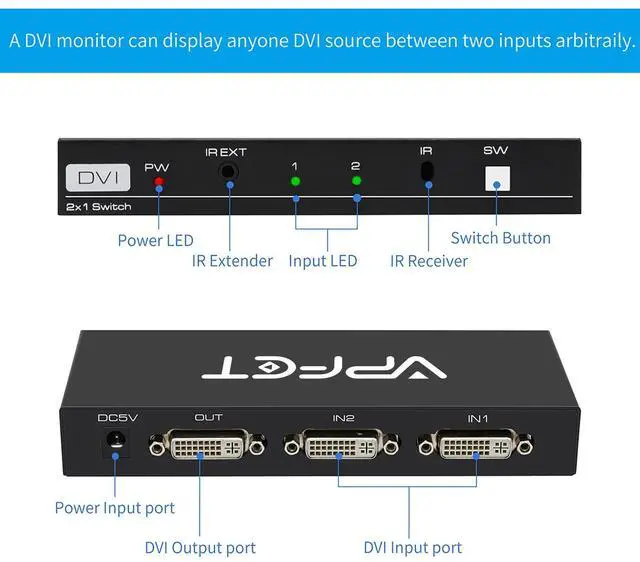[DVI Switch 2 in 1 out]2 ports DVI Switcher, Support 2x DVI inputs, and 1x DVI output, The DVI monitor can display any of the two DVI sources , Both the inputs and output compatible with HDMI. Don't compatible with Dual-Link DVI signals.
