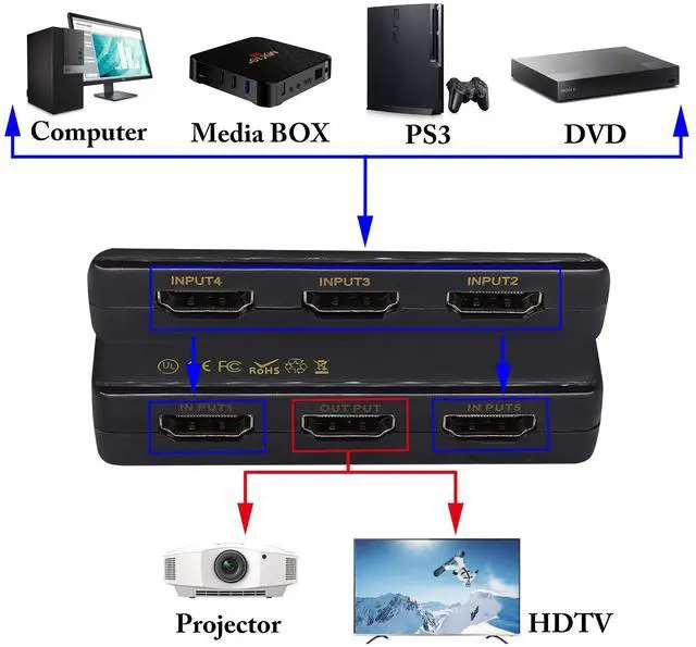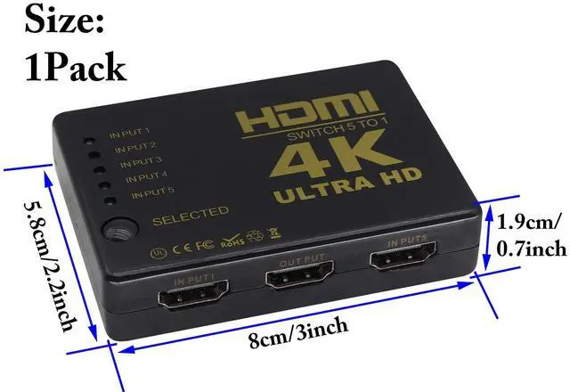 1*HDMI switcher 5 in 1 out, 1*IR receiver, 1*remote control.