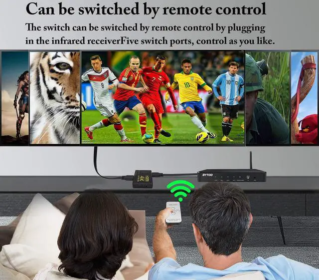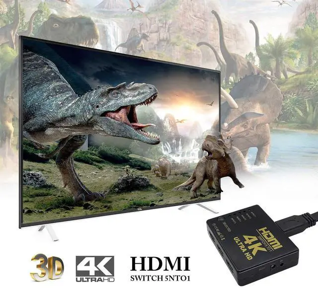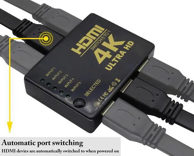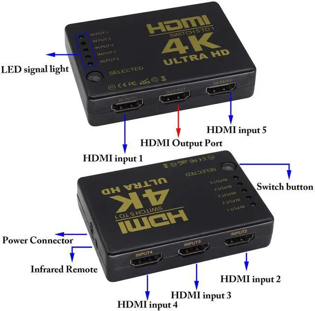 4k*2k HDMI switcher (5 in 1 out) with remote control and infrared receiver.