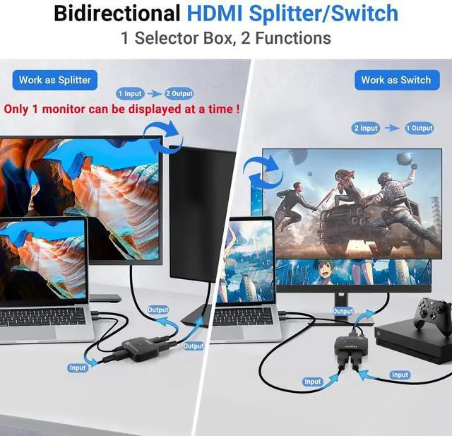 Bi-Directional HDMI 2.1 Switch Splitter - With HDMI switcher, you could connect two HDMI sources to one HDMI display, or connect one HDMI source to toggle between two displays.(Note: Only one monitor can display at a time)