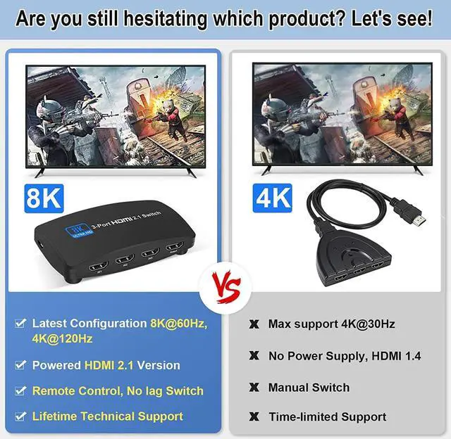 HDMI switch 4K 120HZ uses the latest chips, provides high bandwidth 48 Gbps refresh rate and stable signal transmission.No lag, no flick off or blank screen.