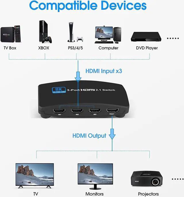 8K 60Hz HDMI 2.1 switch 3 in 1 out, can easily streams video and audio from 3 HDMI devices to 1 HDMI display. The HDMI switch 4K 120 HZ does great help to release yourself from the plugging and unplugging HDMI cables. You will be able to enjoy work time and playtime via easily switching between 3 devices with remote control.