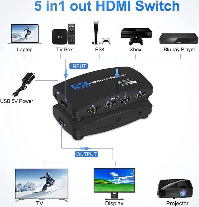 BOSINTIN HDMI Switch 5 in 1 Out 4k 60HZ,HDMI Splitter HDMI Switcher 5 in 1 out with remote Supports Ultra HD Dolby Vision, HDMI 2.0 HDCP 2.2, HDR10 for PS5,PS4,Fire TV/Apple TV/SKY BOX, Projector