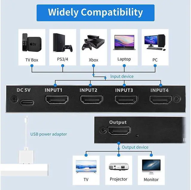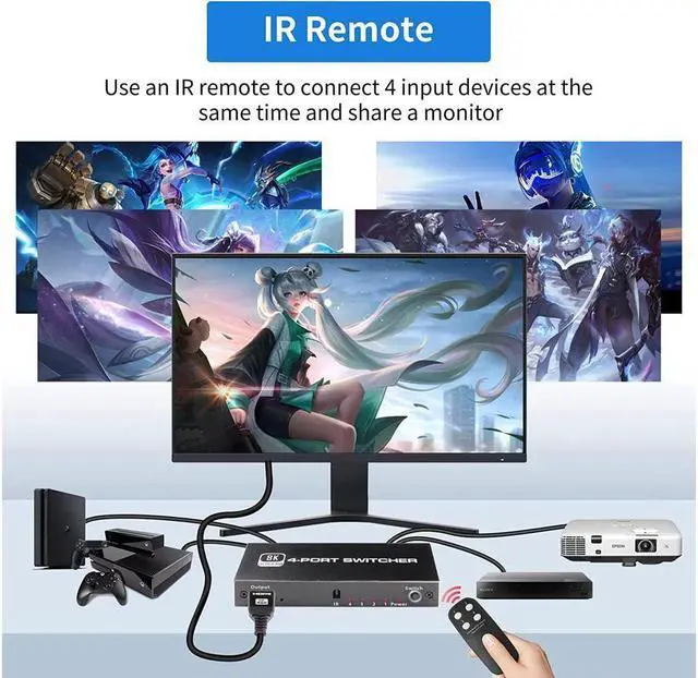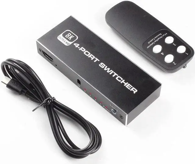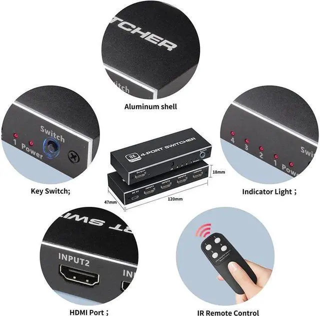 HDMI 2.1 switcher 4 in 1 out with IR remote control, simply connect four HDMI sources to one HDMI display.