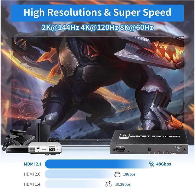 UHD HDMI 2.1 8K Switcher - Support 8K@60Hz, 4K@120Hz, 1080P@240Hz, CEC control, HDR, HCP, DPCP, signal amplification, transmission rate up to 48Gbps,.
