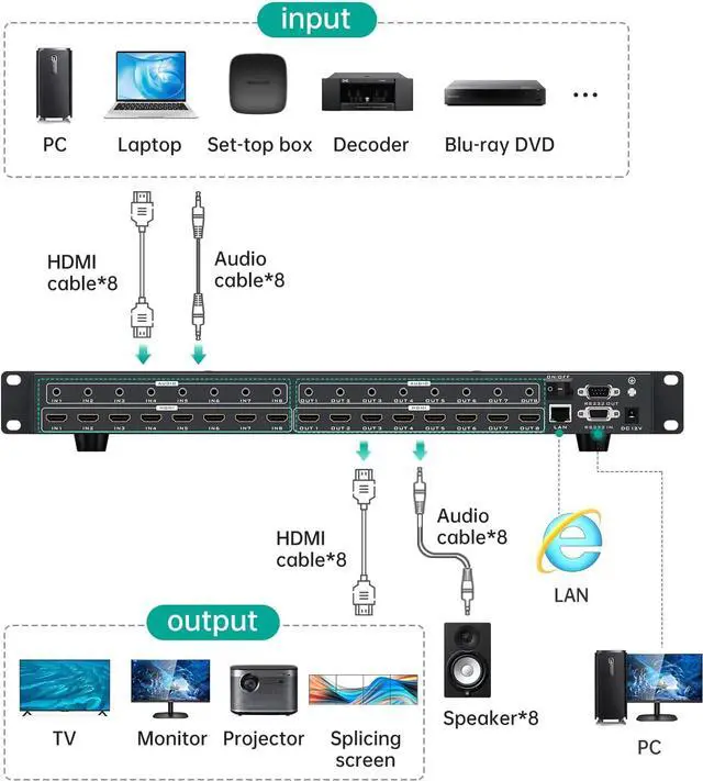 This 8x8 seamless HDMI matrix allows you to connect up to 8 different HDMI sources to the matrix and independently route your video feed to any of the 8 different HDMI displays in 4K@60Hz UHD resolution.